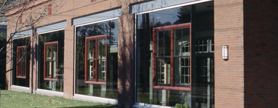 This 11,000 SF Marvin Window retail display showroom and warehouse building is both traditional in design and a cutting edge display of glass technologies. The windows are 1920s retail showroom scale, in a dark tined butt glazing. A residential scale Marvin double hung, clear glazed, window is set into the field of flush glass –like a rear lit theater scrim. The brick building is adjacent to the new 200,000 SF Municipal Facilities building, takes its clue for the interior angled plan from this municipal building’s relationship to the street. This is the first structure to establish a new quality level for the revitalization of Marlboro Street as the new gateway entry to Keene. With the cars out back, the building is along the street, where it belongs.