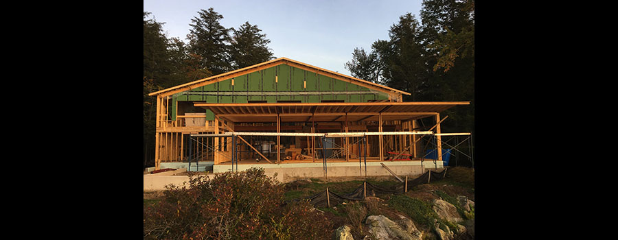 The single story flat roofed lake side living rooms are more modern with expansive glass and a ‘soaring’ roof that